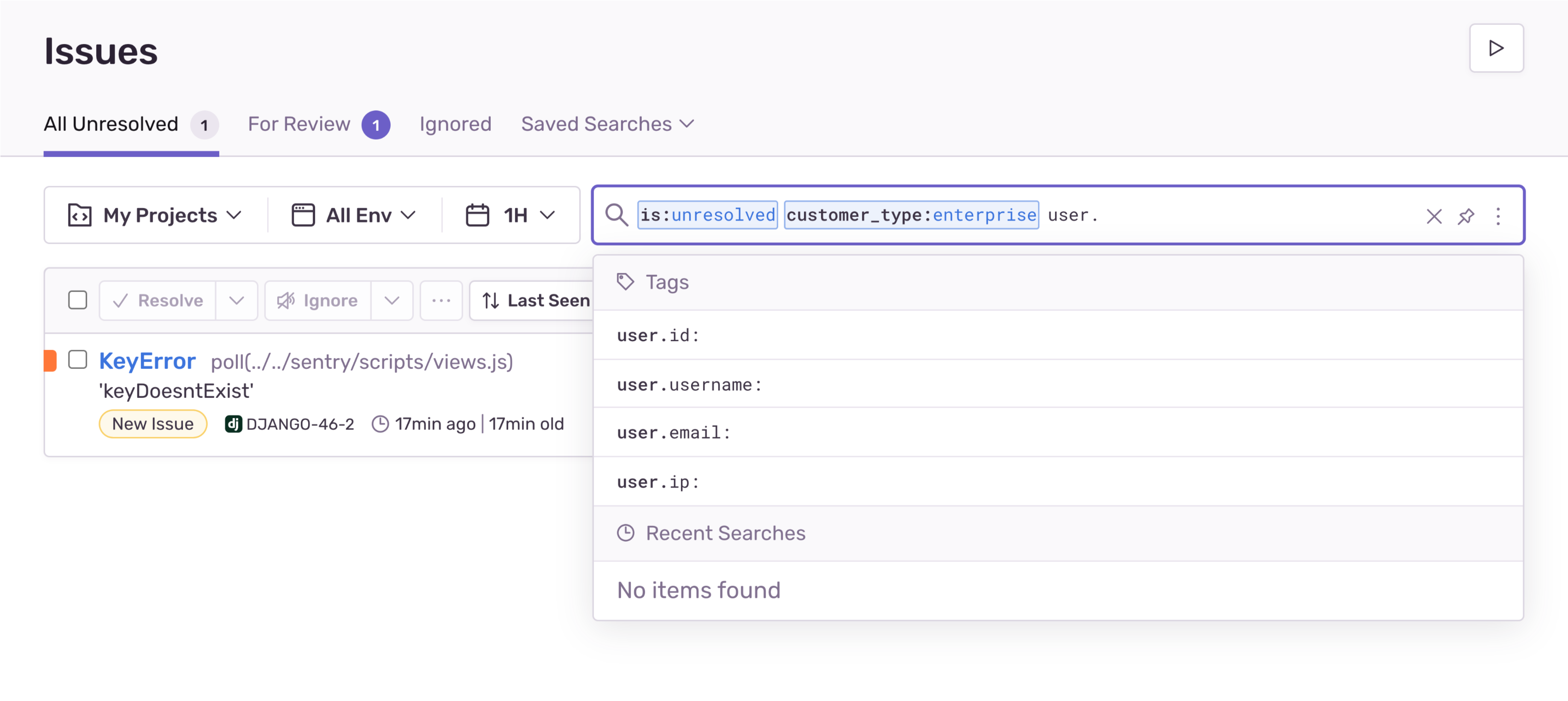 • Search through issues by your custom tags, user context attributes, and release ids in the issue search bar.