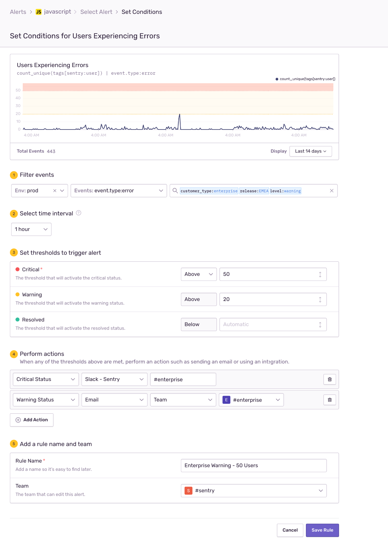2. Metric Alerts: The following rule will trigger a Slack message if more than 50 enterprise end-users in one hour are impacted by warning level errors (from multiple issues) originating from my EMEA releases in my prod environment: