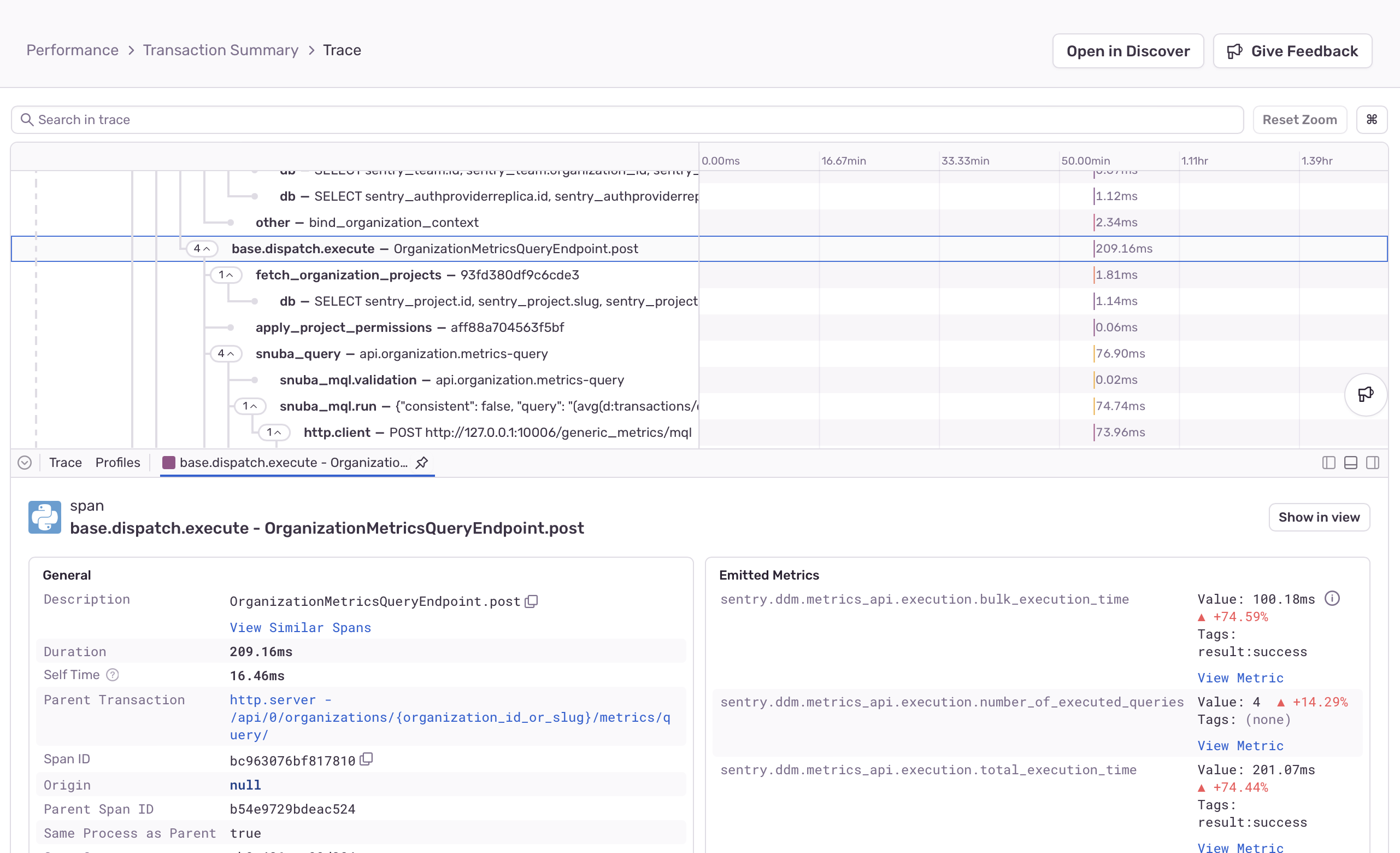 Within the trace view, custom metrics associated with a span are also displayed in the span details.